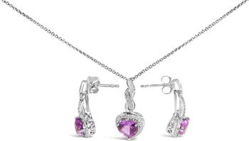 Embrace the opulence of this .925 sterling silver jewelry set, bathed in rhodium for that everlasting shimmer. At its heart, each piece cradles a color-treated, natural purple amethyst, cut into a perfect heart, radiating love and subtle grandeur. Encircling these sumptuous amethysts, created white sapphires cast a halo of light, enhancing the deep violet hues with their scintillating brightness. The pendant dangles gracefully from an 18-inch cable chain, its 7x7mm gem speaking softly of elegance, while the matching earrings, with their 6x6mm stones and secure push backs, echo this motif, completing an ensemble that's as practical as it is enchanting. Ideal for those who treasure beauty and functionality, this set promises to be a timeless addition to any jewelry collection.