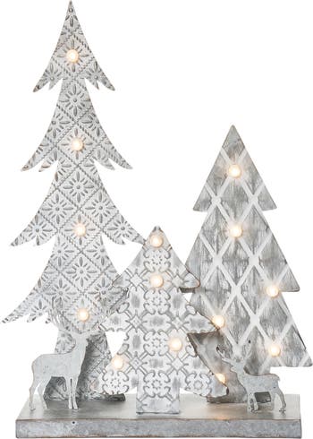 Introducing the Transpac Metal 21.25 in Silver Christmas Rustic Scene a stunning decorative piece that brings the warmth of the holiday season into your home This metal light up rustic scene decor features intricate tree sculptures that illuminate beautifully with LED lights Measuring 21.25 inches in height and 15.5 inches in length and 4.0 inches in width this eye catching piece is perfect for adding a festive touch to your indoor or sheltered outdoor spaces Crafted from durable metal and designed for easy care simply spot or wipe clean to maintain its shine The elegant silver color complements any holiday decor making it a versatile addition to your seasonal decorations Celebrate Christmas in style with this charming light up rustic scene decor