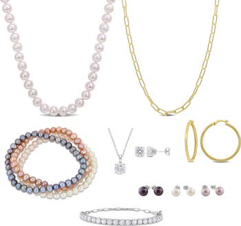 Create all kinds of different looks with this fabulous jewelry collection. This comprehensive 12-piece boxed set includes an 18-inch pearl strand necklace, an 18-inch yellow-plated paperclip link chain necklace, a 7.5-inch lab-created white sapphire tennis bracelet, lab-created white sapphire stud earrings, a lab-created white sapphire solitaire necklace, yellow-plated hoop earrings, 7.5-inch cultured black pearl elastic bracelet, cultured pink pearl elastic bracelet, cultured white pearl elastic bracelet, with cultured black pearl stud earrings, pink pearl stud earrings and white pearl stud earrings. All encased in a beautiful gift box.