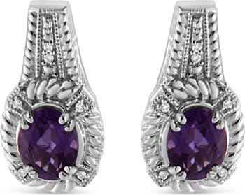 These resplendent amethyst and diamond earrings captures stunning feminine grace. Fashioned in sleek sterling silver, these earrings features a centrally staged oval cut amethyst engrossed by 12 pave set shimmering single cut diamonds embellished by a bright finish rope design on the borders. These treats closes with a secure clasp. Total diamond weight is 1/20 ctw and each amethyst measures 8x6 mm.