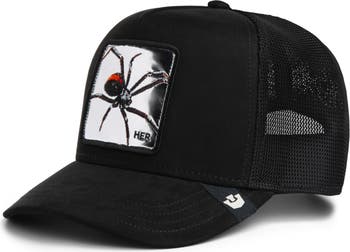 An embroidered spider patch fronts a classic trucker hat constructed with breathable mesh paneling at the sides and back.