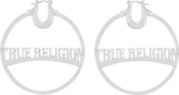 Make a striking statement with these authentic True Religion large hoop earrings. Crafted in a gleaming silver tone, these eye-catching hoops feature the "TRUE RELIGION" brand name boldly cut out within the design, ensuring your style is unmistakably iconic. Perfect for adding a touch of flair and designer edge to any look.