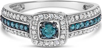This unique ring features a treated blue diamond set within a halo of round white diamonds. The sterling silver band sparkles with a row of treated blue diamonds flanked on either side by white diamonds. It has a total diamond weight of .5 carats.
