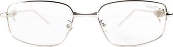 Eyeglass frames made with a silver metal wire, featuring clear polycarbonate lenses with blue-light protection and the signature lens logo. Frames measure 6" in width and each pair comes with a frame box.