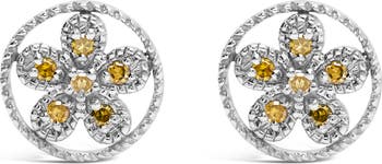 Infuse timeless elegance and a touch of celestial charm into your ensemble with these expertly crafted stud earrings, shaped into a harmonious blend of a star and wheel. Cast from lustrous .925 sterling silver and adorned with a rhodium finish that promises to ward off tarnish, each piece radiates with sophistication. Central to their allure are the sparkling yellow diamonds that, though treated to achieve their vivid shade, are earth-mined and beam with an innate brilliance underlined by their I2-I3 clarity. This pair is distinguished further by the delicate milgrain beading along their borders, evoking the grandeur of art deco styling. Secure comfortably in your ears with dependable push-backs, these earrings offer both a dash of opulence and a seamless wearing experience.