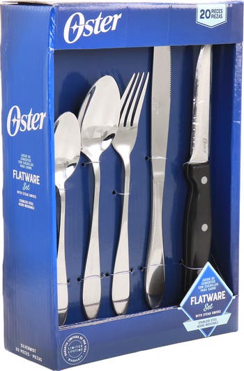 The Oster Silvermist 20 Piece Stainless Steel Flatware Set with Steak Knives will beautify any table setting with its polished quality. This sets stainless steel body is durably made to handle everyday dining use. The included steak knives feature a serrated blade while the forks and spoons have solid well balanced handles. Entertain guest at special dinner parties, use the flatware for daily family meals, or enjoy a quick lunch.