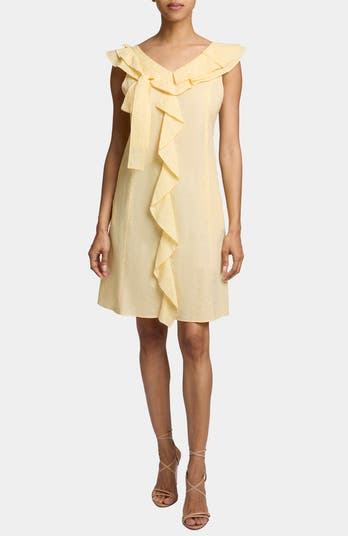 - Cap Sleeve Shift Eyelet Dress with Ruffle Panels in Lightweight Cotton