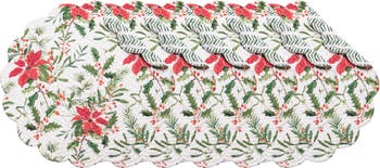 The Silvia Poinsettia quilted tabletop collection is perfect for the holiday season featuring a classic red poinsettia, Christmas holly, and berries pattern. The scallop-edge table linens reverse to a simple chevron pattern for additional styling options. Available as a napkin, placemat, round placemat, and runner. Love this pattern? Silvia Poinsettia is also available as a bedding collection.