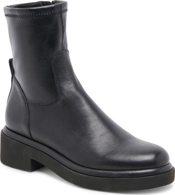 A stretchy shaft and side zipper offer easy wear on a waterproof leather bootie lifted by a subtle platform and chunky block heel.