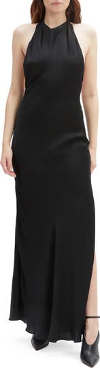 Soft satin drapes elegantly around your figure in a gorgeous evening dress designed with a cowl halter neck and daring open back. A thigh-high side slit adds fluid movement as you mingle throughout the crowd.
