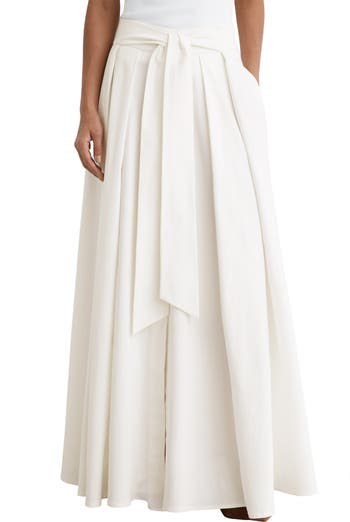 This maxi skirt is cut from a weighty cotton-lyocell blend with a touch of stretch, holding crisp pleats while draping beautifully. A self-tie belt defines the waist, a center-front slit adds ease with every step, and side slip pockets keep it practical.