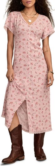 Sweet and sophisticated, this lace-trimmed midi dress pairs delicate tonal texture with an effortlessly romantic silhouette that laces up in the back. It’s the perfect pick for daydream-worthy moments.