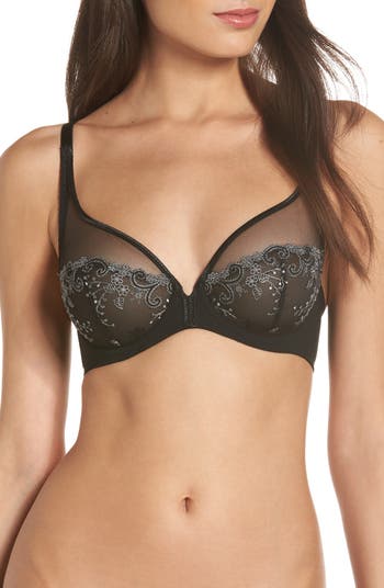 Supportive underwire cups offer exceptional lift and shape to a plunge-neck bra designed in France and detailed with pretty embroidery and guipure lace.