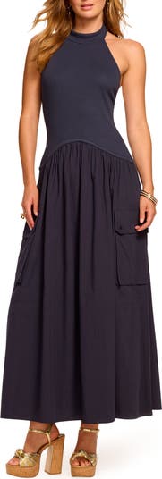 A halter neckline creates an alluring open back on an ankle-grazing mixed-media maxi fashioned with a drop waist for on-trend appeal.