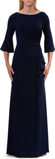 Chic evening dress with a high neckline and three quarter bell sleeve. The waist features a draped design and ruching. Back zipper closure.