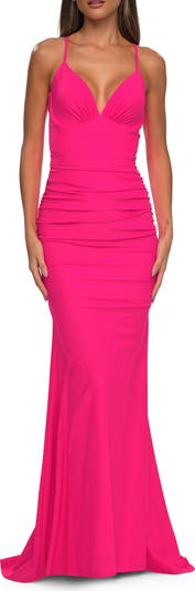 Simple soft jersey dress with low open lace up back and ruching along the zipper. Front features ruching and defined ruched cups. Back zipper closure.