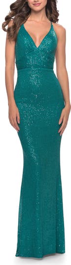 Simple line sequin long dress with banded waist and V neckline. Lace up strappy back. Back zipper closure.