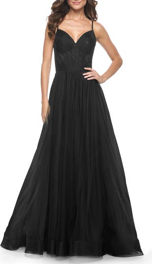 Simply chic tulle a-line dress with criss cross ruched bodice and high slit. Back zipper closure.