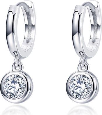 Bezel-set simulated diamonds add sparkle to the gleam of these huggie hoops made from hand-polished platinum-bonded sterling silver.