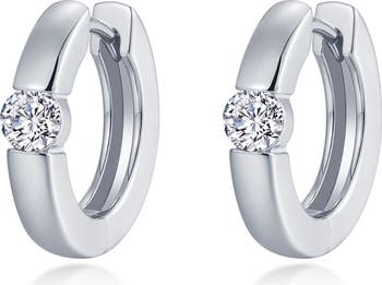 Delicate lab-created diamonds add twinkling punctuation to the sleek curves of these high-polished huggie hoops.