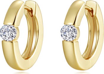 Delicate lab-created diamonds add twinkling punctuation to the sleek curves of these high-polished huggie hoops.
