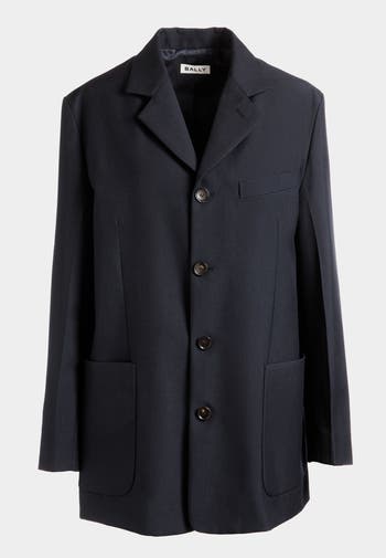 Single-breasted jacket in a navy blue wool blend. Tailored to perfection, this jacket fastens at the front with four large horn buttons. The understated silhouette is embellished by no-fuss details: large patch pockets, horn buttons and a notch lapel.