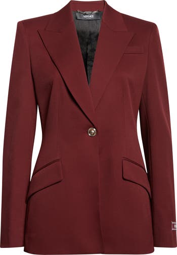 Versace opulence collides with trad tailoring in this trim hourglass blazer fashioned from stretch-kissed wool gabardine and decorated with polished Medusa-head hardware—a nod to the molded door of the maison's first headquarters. An archival logo on the left sleeve continues the throwback theme.