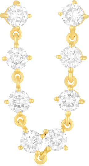 This single drop earring sparkles with a chain of eight round-cut diamonds and is connected by two studs that are designed to be worn in two piercings.