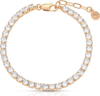 Sparkling round cubic zirconia shine in prong settings along this timeless tennis bracelet plated in warm 18-karat gold.