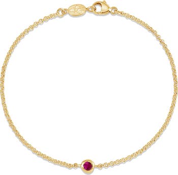 Perfect for day or night, this sterling silver Dewdrop chain bracelet features a single ruby encased in a dainty nugget setting, with an 18ct yellow gold vermeil finish. Fasten securely with our signature quatrefoil lobster catch and wear alone or stack with other bracelets for a layered look. Complete your outfit with a stack of our matching Twinkle rings.