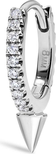 A gleaming 18-karat gold spike gives a sharp glint to this clicker hoop earring traced in sparkling diamonds.