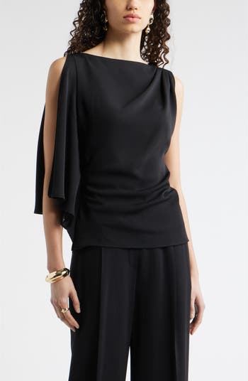 A single split sleeve works overtime to bring the drama to any look you build around this top cut from a fine, drapey wool-blend crepe.