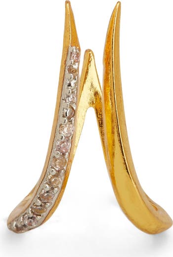 The Sinna Ring is handcrafted in 22k gold-plated brass and set with a row of brilliant white cubic zirconia. Its adjustable design ensures a comfortable fit while the geometric motif creates a modern yet timeless statement.