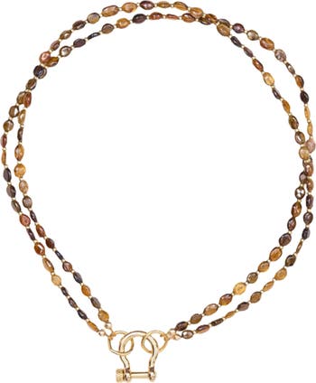 Discover elegance with our 17 inch double stranded petro-tourmaline necklace, featuring 14 karat gold plated hardware and an enamel carabiner. Perfect for adding a touch of sophistication to any outfit.