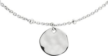 A small, hammered-silver disc pendant glimmers like a seashell seen through sunlit water as it sways softly from a delicate rondelle-stationed chain.