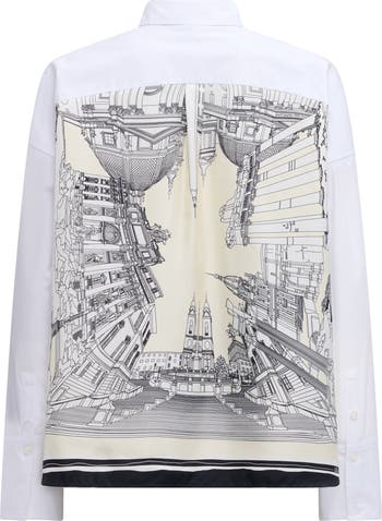 The Sirene has a small point collar and classic button front opening. The dropped shoulder line is balanced with slim sleeves which are finished with button cuffs. The body shape is square with an easy relaxed fit. The shirt has a back panel made in silk twill, featuring the CALLAS original scarf print of Rome.