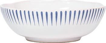 Delft blue stripes on the subtly scalloped rim put tiny exclamation points on everything you seve in this finely glazed stoneware bowl.