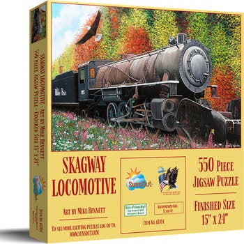 Embark on a timeless journey with the Skagway Locomotive 550 Piece Jigsaw Puzzle by SunsOut Inc. Step back into history and savor the charm of vintage trains, as you assemble a dazzling scene based on artist Mike Bennett's stunning depiction of classic railroads. This meticulously crafted, 15" x 24" puzzle engages adults with its perfect blend of challenge and enjoyment. Precision craftsmanship guarantees a snug fit between pieces, enhancing your puzzling experience, while the eco-friendly design using high-quality recycled cardboard and soy-based inks shows SunsOut's commitment to sustainability. SunsOut not only places great emphasis on user enjoyment and environmental consciousness, but it also promises customer satisfaction by offering a worry-free guarantee for any missing or damaged pieces. Celebrating American artistry, the puzzle features fully licensed artwork by renowned artist Mike Bennett and embodies the dedication of the woman-owned business. As a perfect gift for train enthusiasts, each box presents a vibrant full-color display promoting eager anticipation of the adventure within. The iconic Skagway Locomotive puzzle invites you to partake in a thrilling journey of imagination and exploration, while piecing together snapshots of historical locomotion.