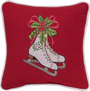 Tie up your style this winter with this 10 x 10 embroidered Skates and Holly Pillow. Featuring a fun pair of traditional winter ice skates tied together with a cheerful red ribbon and filled with holly berries and leaves, this cozy cushion will transform any space into a winter wonderland.