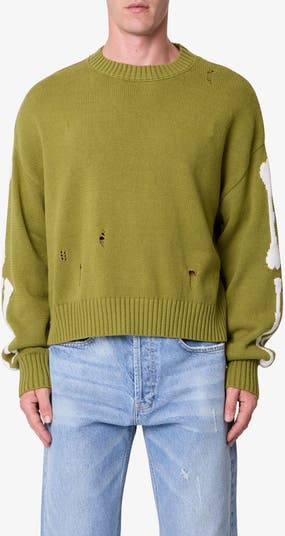 An intarsia skeleton provides a whimsical anatomy lesson in this lightweight and slouchy crewneck sweater.