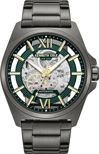 Skeleton Gunmetal Automatic Bracelet Watch, 44mm