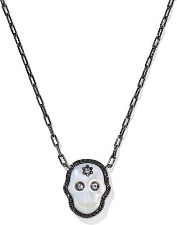 This necklace features a mother-of-pearl skull pendant framed by signature hoof-print detailing for a perfectly spooky look.