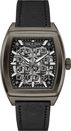 Skeleton Tonneau Automatic Leather Strap Watch, 41mm
