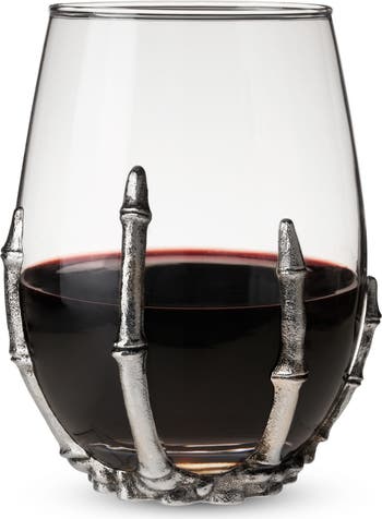 - Stemless 12 oz wine glass with skeleton hand base Perfect for wine, cocktails, and spirits Durable glass with sculpted metal detailing Great for Halloween or gothic decor lovers Hand wash recommended