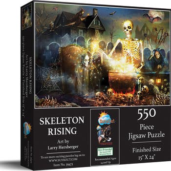 Experience the eerie allure of Halloween through the artistry of Larry Hersberger with the Skeletons Rising 550 piece jigsaw puzzle from SunsOut. Made from high-quality recycled cardboard and boasting a meticulous craftsmanship, this stunning piece of art measures 15" x 24" when assembled, enchanting puzzle enthusiasts and Halloween lovers alike. SunsOut is well-renowned for its interlocking random-shaped pieces that ensure a flawless final image and offers a satisfying assembly experience for adults. In an aim to protect the environment, each of their puzzles uses eco-friendly soy-based inks and recycled board materials, reflecting their dedication to a sustainable future. This one-of-a-kind puzzle showcases the hauntingly beautiful world envisioned by licensed artist Larry Hersberger, with every piece featuring intricate details and vibrant colors that will keep puzzlers engaged excitedly. Keep the spooky spirit of Halloween alive all through the year with Skeletons Rising, a perfect delight for those cozy nights indoors and a celebration of the seasons’ charm and allure. This eco-friendly and artistically appealing puzzle makes for an unforgettable gift for puzzle enthusiasts, promising hours of fun-filled entertainment. Support a women-owned small business passionate about creating earth-friendly entertainment and bring home the exhilarating mystery of Skeletons Rising today.