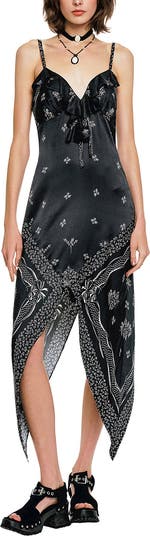 Sweet and tantalizing, this slip dress captures Anna Sui’s signature whimsical elegance. The scalloped sweetheart neckline and delicate straps frame the shoulders gracefully, while a charming bow on one side adds a playful touch. Detailed floral embroidery at the center enhances the romantic aesthetic, and the flowing chiffon drapes beautifully around the body, creating a dreamy, ethereal silhouette. Perfect for day-to-night styling or special occasions, this dress embodies both wonder and sophistication.