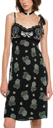 Sweet and tantalizing, this slip dress captures Anna Sui’s signature whimsical elegance. The scalloped sweetheart neckline and delicate straps frame the shoulders gracefully, while a charming bow on one side adds a playful touch. Detailed floral embroidery at the center enhances the romantic aesthetic, and the flowing chiffon drapes beautifully around the body, creating a dreamy, ethereal silhouette. Perfect for day-to-night styling or special occasions, this dress embodies both wonder and sophistication.