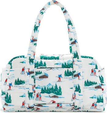 The Puffer Grande Duffel is designed with a chic puffy and protective style that is lightweight, durable and water resistant. Crafted with style in mind, this duffel is designed is perfect for weekend getaways offering ample space and functionality for all your essentials. The soft, puffy exterior, padded shoulder straps, trolley slide, and lots of pockets allows for an ultra-light carry-on experience. Custom Puffer Print. Lined in Après Ski Print. Double zippers. Stain resistant, waterproof, wipeable inside and out.