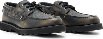 Lizard embossing adds a distinctive textural element to a classic leather boat shoe crafted in Portugal.