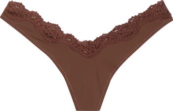 This buttery-soft front-dipped thong trimmed in lace perfectly molds to your body and virtually disappears under clothing.